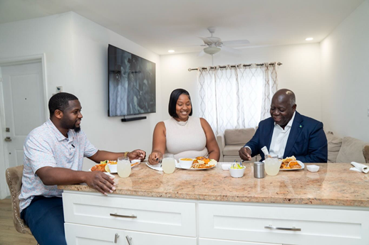 A HOME OF THEIR OWN: Prime Minister Philip Davis has lunch at the home of Mr. & Mrs. Garrard and Brittany Lightbourne, catching up on their journey since moving into Renaissance, the government subdivision at Carmichael in 2024. Our photo of the week. 4 March 2026